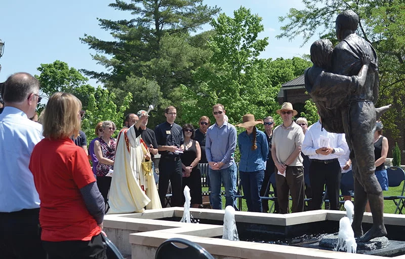Father Jay Kythe, OSB, blesses a statue at Maur Hill-Mount Academy in Atchison that depicts St. Maur rescuing a young St. Placidus from drowning. The statue was donated by Rich and Cindy Dickason. The couple has donated multiple pieces of religious art to Atchison area institutions. LEAVEN PHOTO BY ERIN HUNNINGHAKE