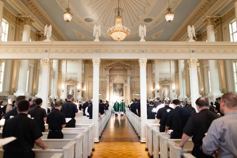 Seminarians attend Mass in 2017 in the Chapel of the Immaculate Conception at Mundelein Seminary in Illinois, near Chicago. More than 200 seminarians from 34 dioceses study at the seminary on their path to the priesthood. The U.S. bishops will start 2019 with a spiritual retreat Jan. 2-8 at Mundelein to pray and reflect on the important matters facing the Catholic Church such as the abuse crisis. (CNS photo/courtesy Mundelein)