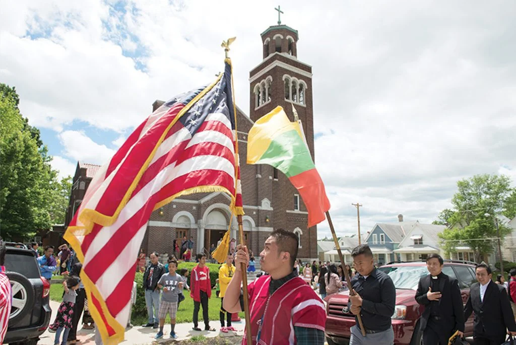 The American, papal and Myanmar flags symbolized how Catholic refugee families from Myanmar carried their faith and heritage halfway around the world to become new Americans and establish a community in the Archdiocese of Kansas City in Kansas.