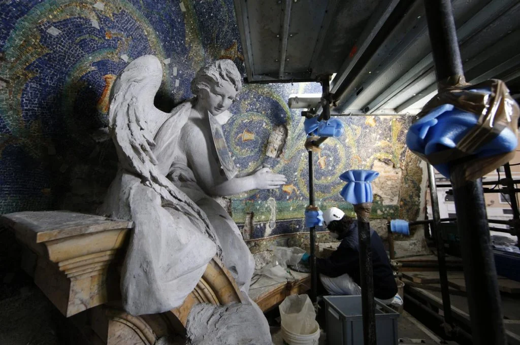 The restorers are using old photographs and drawings to see what the mosaic looked like before the 1940s restoration, which had “violated the integrity” of the artwork when workers detached the mosaics “in blocks” and embedded them in cement, he said. This altered what had been there since a previous restoration in the 1600s.