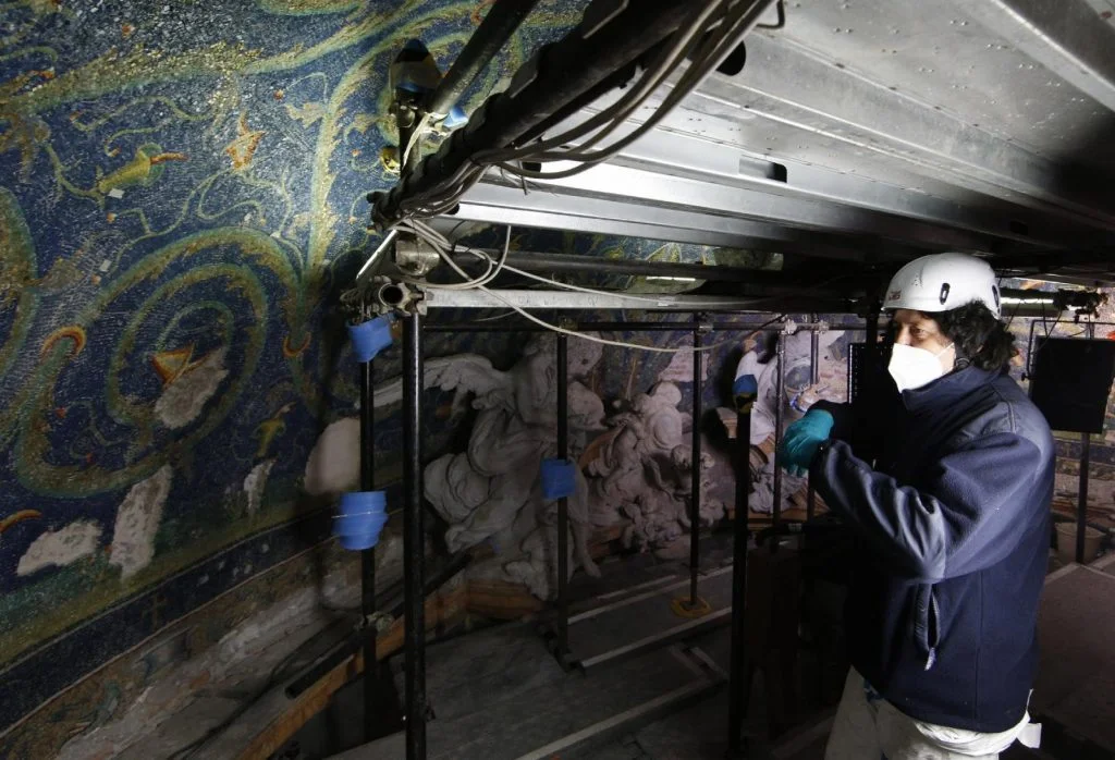 Most often, water, time and grime are an artwork’s worst enemy, but sometimes the damage is caused by past restorers. That is what mosaicist Roberto Cassio and his small team from the Vatican Museums found when they set up scaffolding and got a close look at mosaics in the chapel’s small apse and on a side wall, Schroth said.