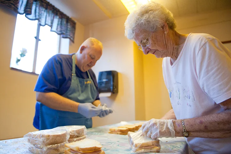 Larry Lesser, a member of Sacred Heart Parish in Topeka, and Mary Kirk, a member of Mater Dei Parish in Topeka, prepare the day’s sandwiches. The ministry typically hands out more than 100 sandwiches a day.