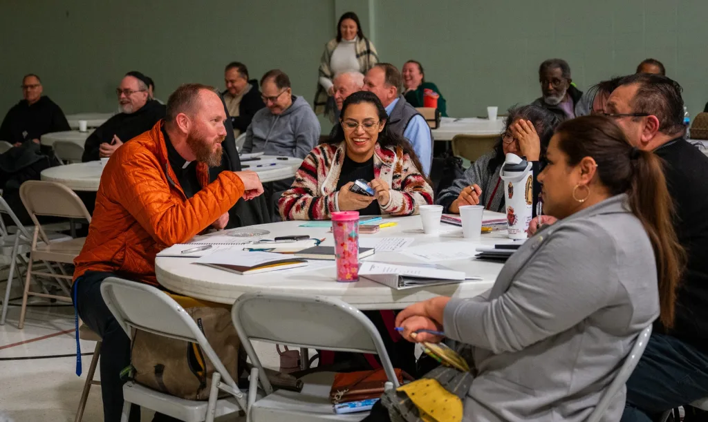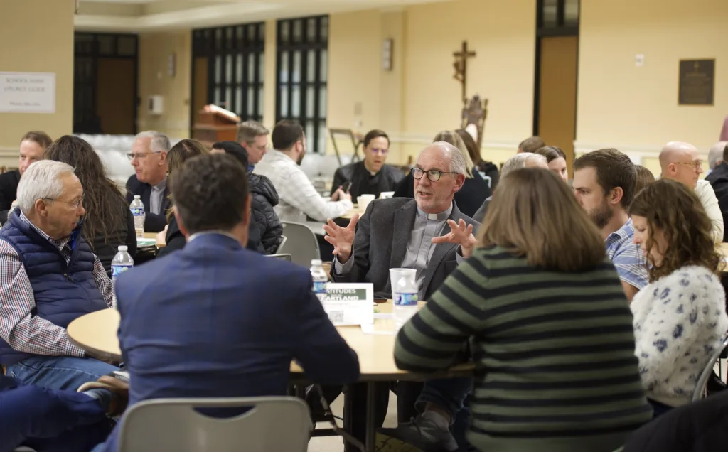 Father Nick Blaha, pastor of Blessed Sacrament Parish in Kansas City, Kansas, talks with members of the Wyandotte County Deanery at a deanery meeting at the cathedral on Feb. 3. Archbishop McKnight and his synodal team shared their vision for “A Renewal from the Heartland” with all the deaneries via Zoom. LEAVE PHOTO BY KATHRYN WHITE