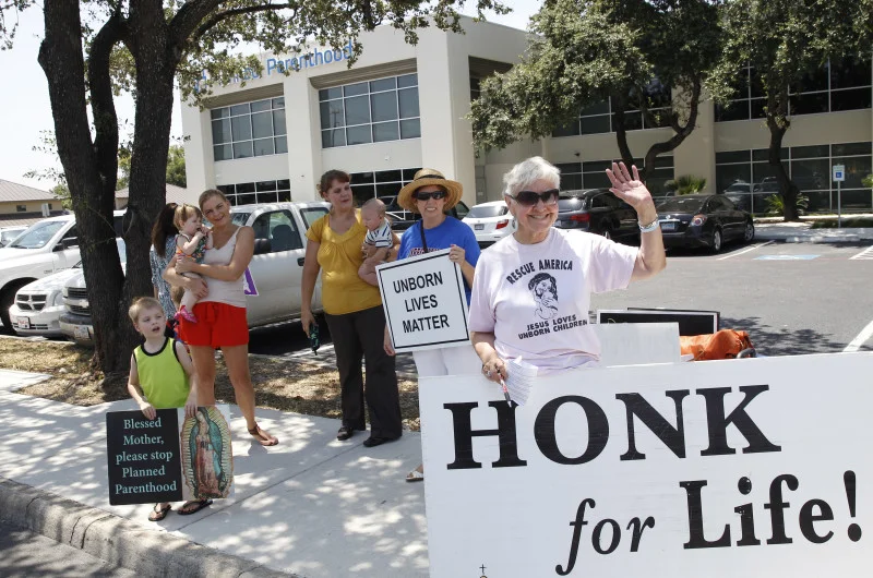 People protest Aug. 6 in San Antonio on a sidewalk outside a Planned Parenthood clinic that performs abortions. Federal and state lawmakers have called for an investigation of Planned Parenthood and defunding it after the organization's top physicians were videotaped talking about ways to perform abortions to better salvage intact fetal tissue and organs intact to sell to researchers. (CNS photo/Paul Haring)