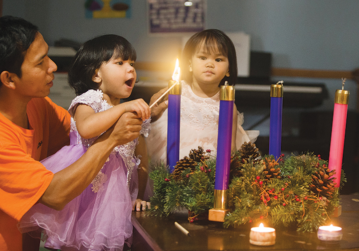 Simon Due assists his 2-year-old daughter Marykhin Ngwe with lighting the traditional Advent wreath as his 1-year-old daughter Stephanie Due looks on. Simon, his wife Helena and the two girls are members of the Chin Burmese Community of St. Patrick Parish in Kansas City, Kansas. Advent begins on Nov. 27.