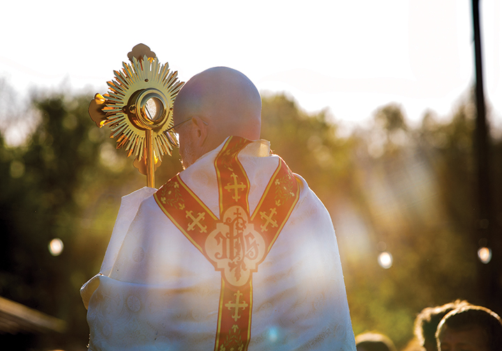 Deacon Jody Madden of St. Benedict Parish in Atchsion processes in to the St. Andre Orchard in Atchison with the Blessed Sacrament. Leading him is Isaac Trotter, a senior at Maur Hill-Mount Academy and member of the North East Kansas Rural Youth Council (NEKRYC), which hosted the event. LEAVEN PHOTO BY JAY SOLDNER