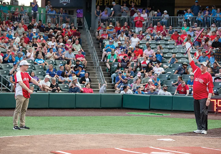 To the delight of the crowd, Archbishop Emeritus Joseph F. Naumann steps up to the plate while Archbishop Shawn McKnight prepares to serve as his designated runner. LEAVEN PHOTO BY JAY SOLDNER