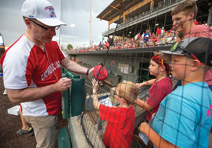Archbishop Shawn McKnight signs autographs for young fans at the annual Pitching for Priests game Aug. 8 at Legends Field in Kansas City, Kansas. LEAVEN PHOTO BY JAY SOLDNER