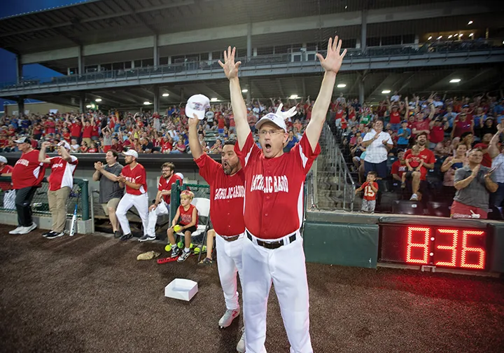 Archbishop Emeritus Joseph F. Naumann joined Archbishop McKnight on the sidelines to support the priests in red. He also stepped up to the plate, earning two hits while Archbishop McKnight served as a pinch runner both times, to the delight of the crowd.