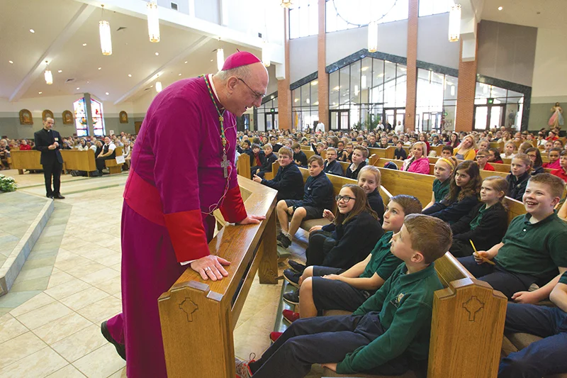 Archbishop Joseph F. Naumann answers questions at the end of Fifth-Grade Vocation Day April 10 at Prince of Peace Parish in Olathe. LEAVEN PHOTO BY JAY SOLDNER
