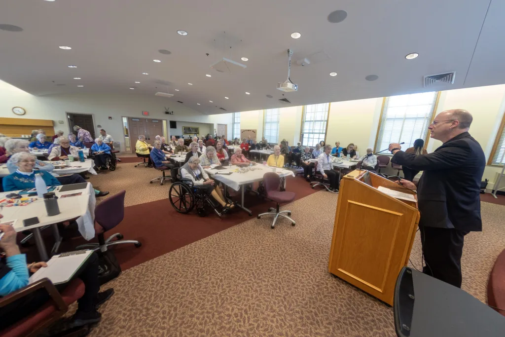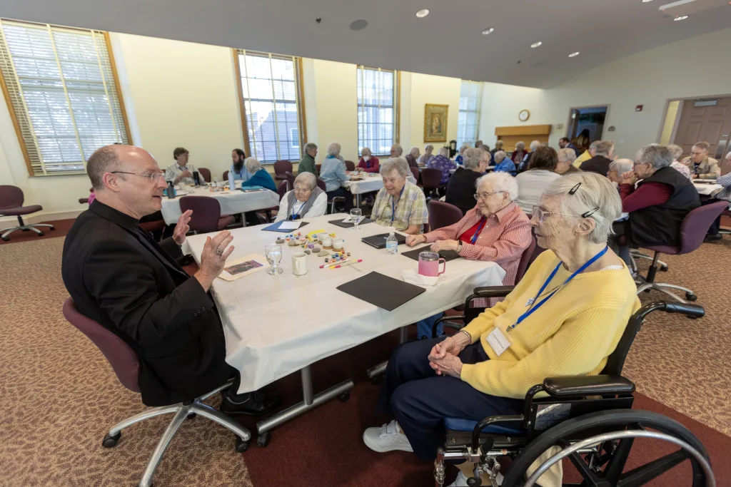 Archbishop Shawn McKnight chats with a group of the Sisters of Charity of Leavenworth during his visit to the motherhouse on Nov. 5. LEAVEN PHOTO BY JAY SOLDNER