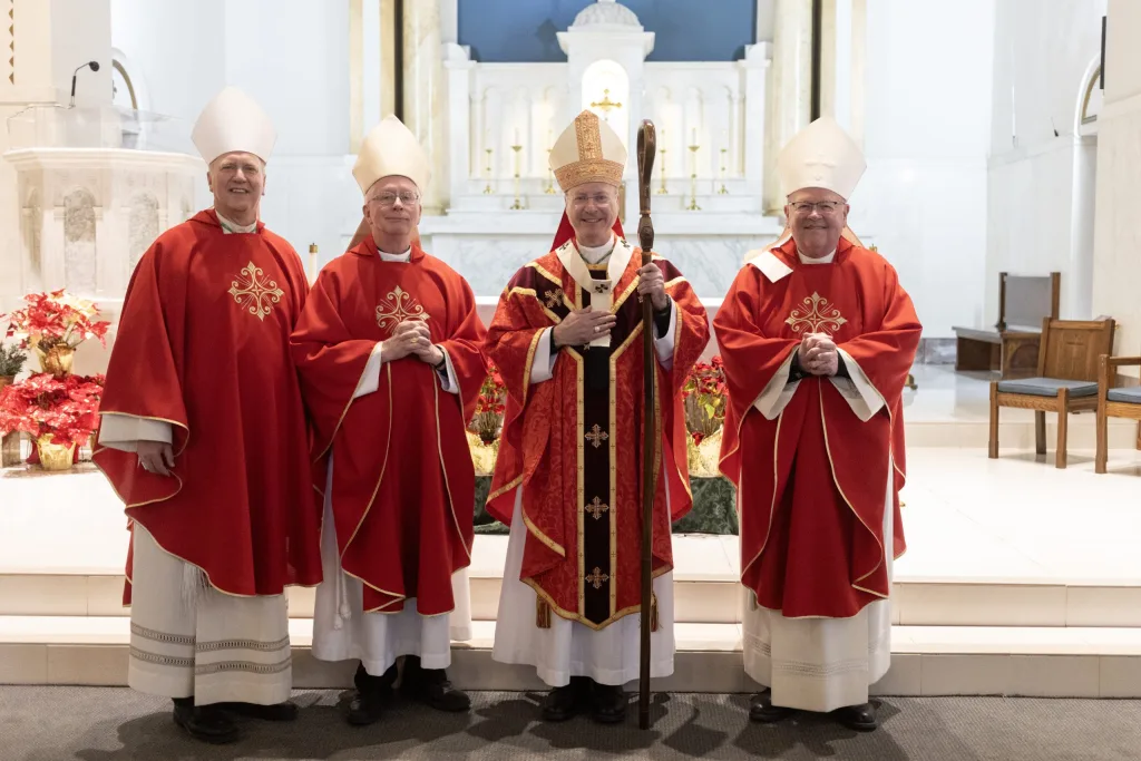 From left, Bishop Gerald Vincke of Salina, Bishop John Brungardt of Dodge City, Archbishop Shawn McKnight of Kansas City, Kansas, and Bishop Carl Kemme of Wichita pose for a photo following the Red Mass at Assumption Church in Topeka on Jan. 27. LEAVEN PHOTO BY JAY SOLDNER