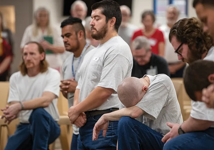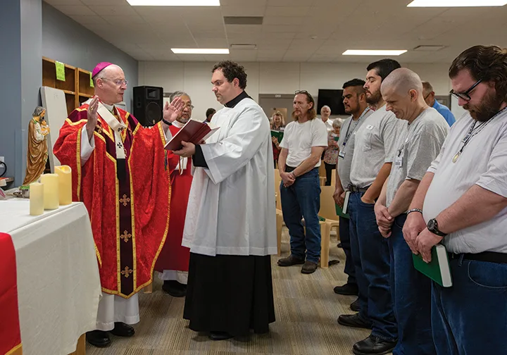 The four men, dressed in simple blue jeans and white T-shirts, listened quietly as Archbishop McKnight’s homily explored the seven gifts of the Holy Spirit. He talked about wisdom; understanding; good counsel; knowledge; and the importance of fortitude, the courage to stand firm in one’s values even when surrounded by a culture that may not share them.