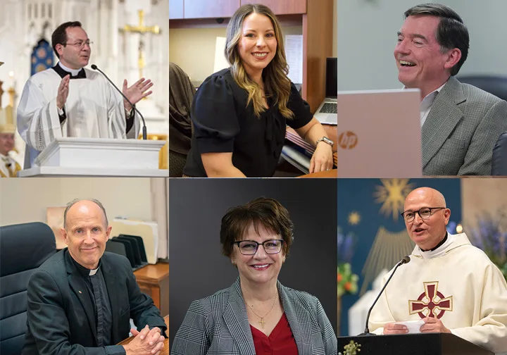Archbishop McKnight’s cabinet members are, from top left moving clockwise, Father Anthony Saiki, Marissa Easter, Chris Arth, Father Michael Hawken, Carla Mills and Father Mark Mertes.