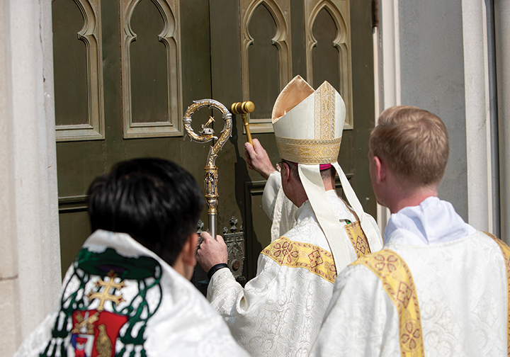 The archbishop knocked on the door of the cathedral, then was invited in by its rector, Father Anthony Saiki, at the 10 a.m. Mass June 1.