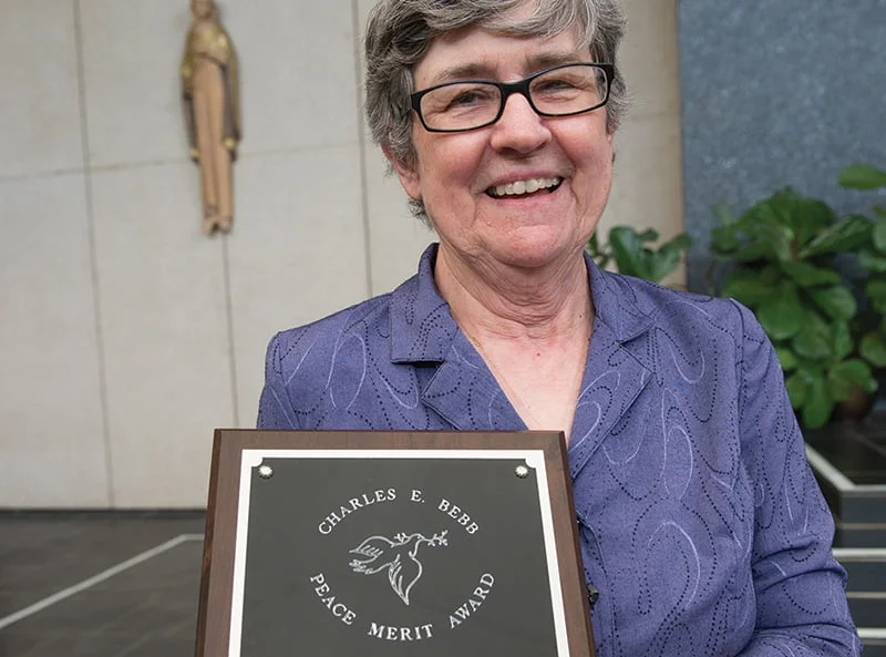 In recognition for her work in the field of peace and justice, Sister Barbara McCracken, OSB, was given the Charles E. Bebb Peace Merit Award by PeaceWorks of Kansas City. LEAVEN PHOTO BY JOE BOLLIG