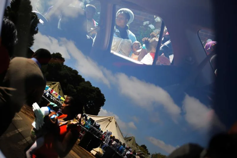 In this April 20, 2015, file photo, mothers and children are reflected in a vehicle window as they wait for food at a Red Cross refugee camp set up for foreign residents in Johannesburg, South Africa. South African bishops said South Africans need to have a candid conversation on racism. (CNS photo/Kim Ludbrook, EPA)