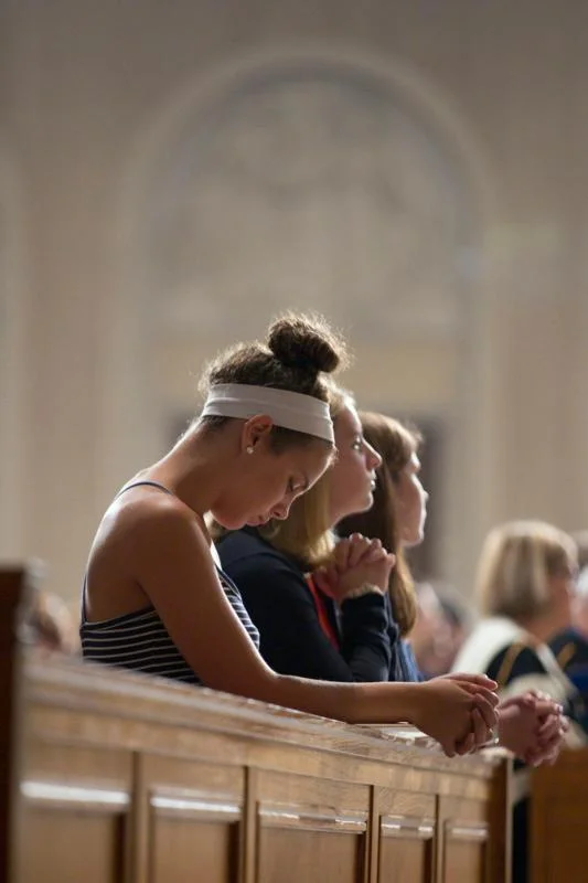 Students of The Catholic University of America and others pray during the school’s annual Mass of the Holy Spirit, Sept. 3, at the Basilica of the National Shrine of the Immaculate Conception in Washington. (CNS photo/Jaclyn Lippelmann, Catholic Standard)