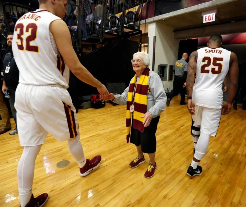 The 5-foot nun can be seen at every home game of the men’s team. She’s most often decked out in Loyola gear and wearing her trademark maroon Nike tennis shoes with gold laces that have “Sister” stitched onto the heel of her left shoe and “Jean” stitched on the heel of her right shoe.
