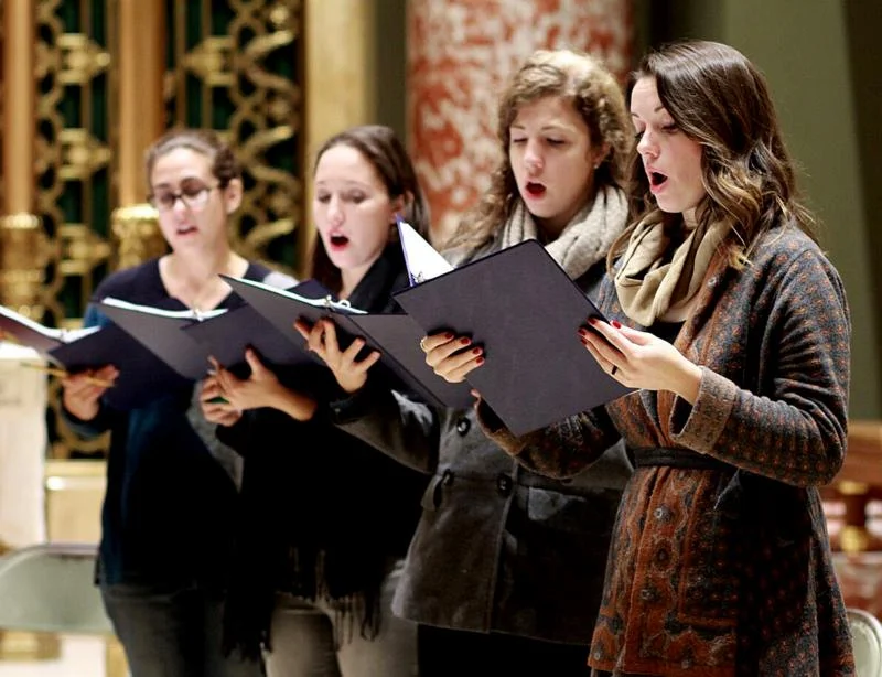 Amanda Sidebottom, Elizabeth Merrill, Grace Bernardo and Clare Maloney, members of the Choir of the Church of Our Saviour in New York City, record music at the church in October for “Hark! A Thrilling Voice Is Sounding,” a CD of sacred Advent and Christmas music. (CNS photo/Harold Levine, courtesy Church of Our Saviour)