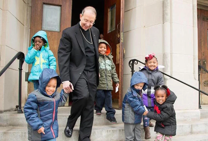Archbishop William E. Lori of Baltimore walks with children from Catholic Charities Head Start Nov. 30 after helping distribute 1,000 winter coats donated by the Knights of Columbus to neighborhood children at St. Edward in Baltimore. (CNS photo/Olivia Obineme, Catholic Review)