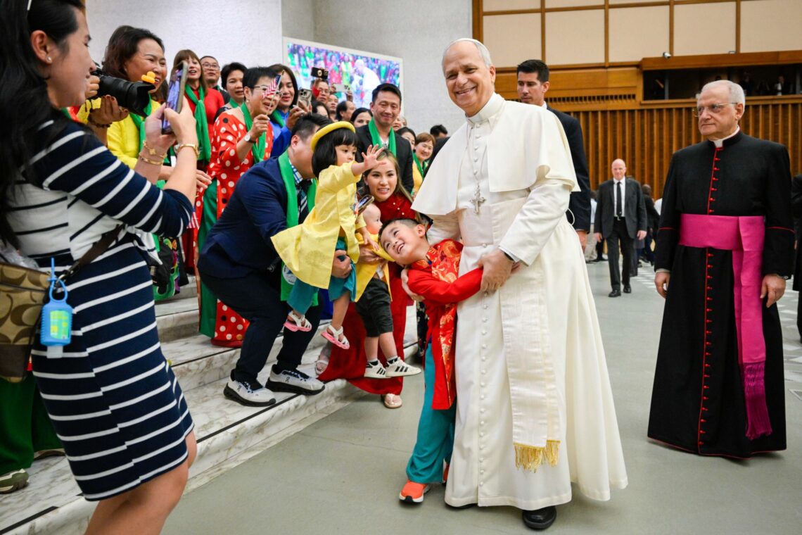 Pope Leo XIV greets children and families in traditional attire during his weekly general audience in the Paul VI Audience Hall at the Vatican Aug. 27, 2025. (CNS photo/Vatican Media) por Cindy Wooden Catholic News Service CIUDAD...