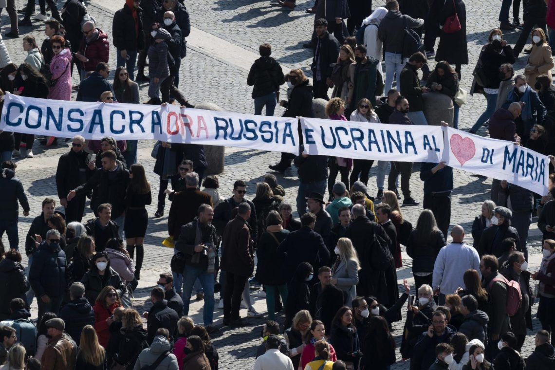 A sign in St. Peter’s Square calls for the consecration of Russia and Ukraine to Mary as Pope Francis leads the Angelus from the window of his studio overlooking the square at the Vatican March 6, 2022. In his Angelus...