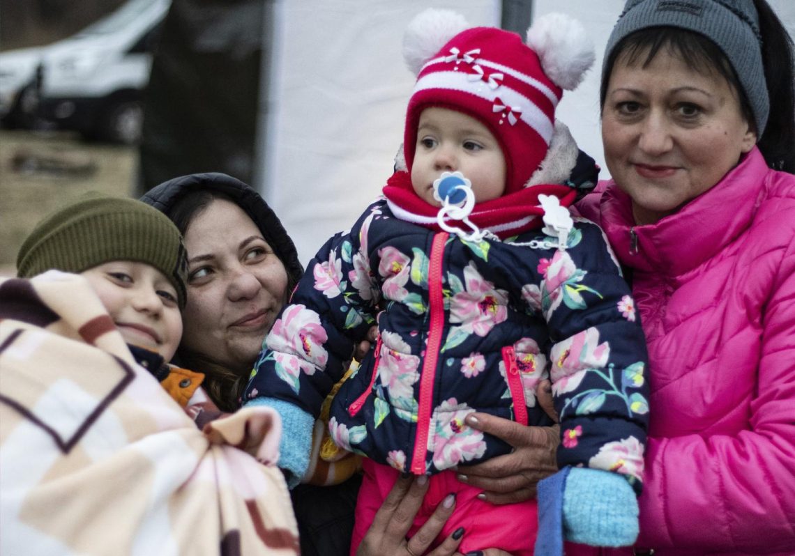 Yulia Tankano is pictured with her two children, Maksim and Victoria, and the children’s grandmother, Valya, at a “refugee hub” at a former supermarket in Przemysl, Poland, near the Urkainian border, March 3...