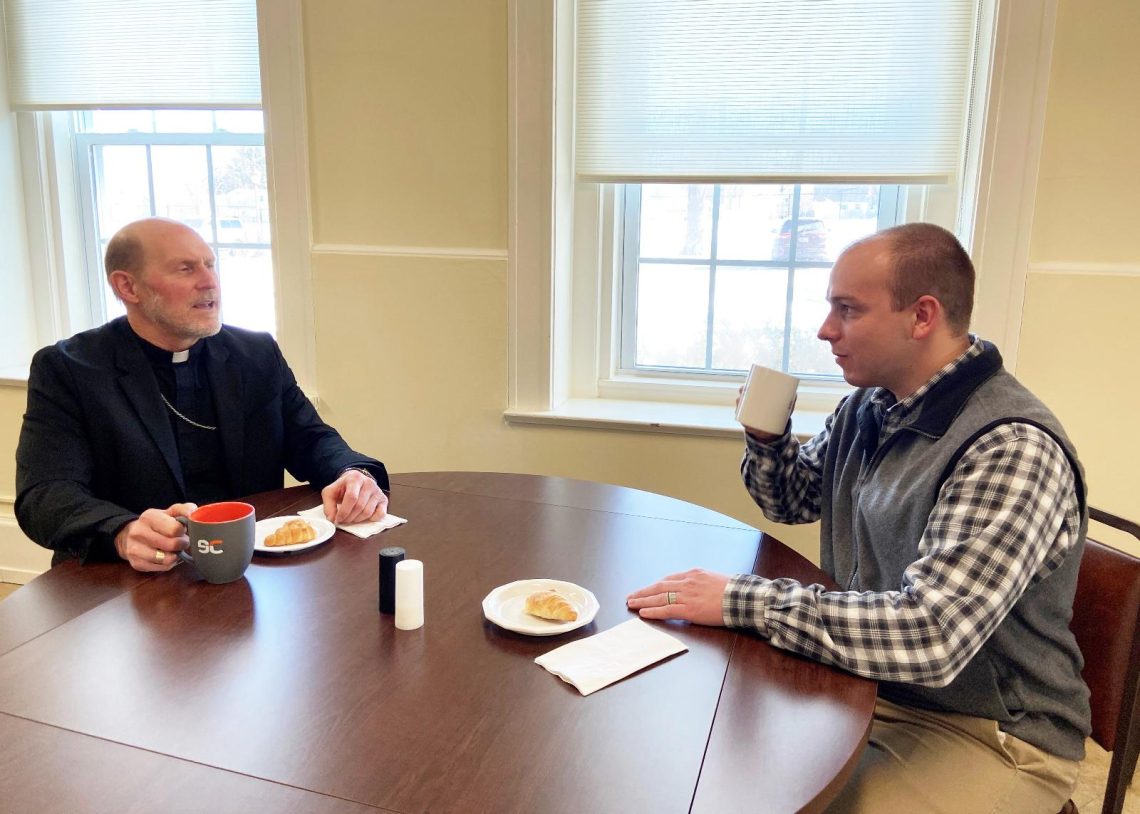 Bishop Thomas R. Zinkula of Davenport, Iowa, and Patrick Schmadeke, diocesan director of evangelization, have a conversation Jan. 28, 2022, about the “58,000 Cups of Coffee Initiative.” It is “a deep and...