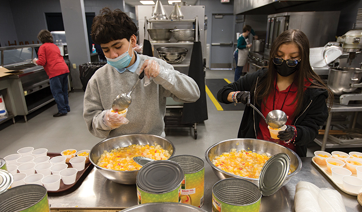 Adrian Miller and Sheila Hernandez, eighth graders at Holy Name School in Kansas City, Kansas, measure out fruit cups to be served with lunch at St. Mary’s Food Kitchen. The kitchen is celebrating its 40th year of operation...