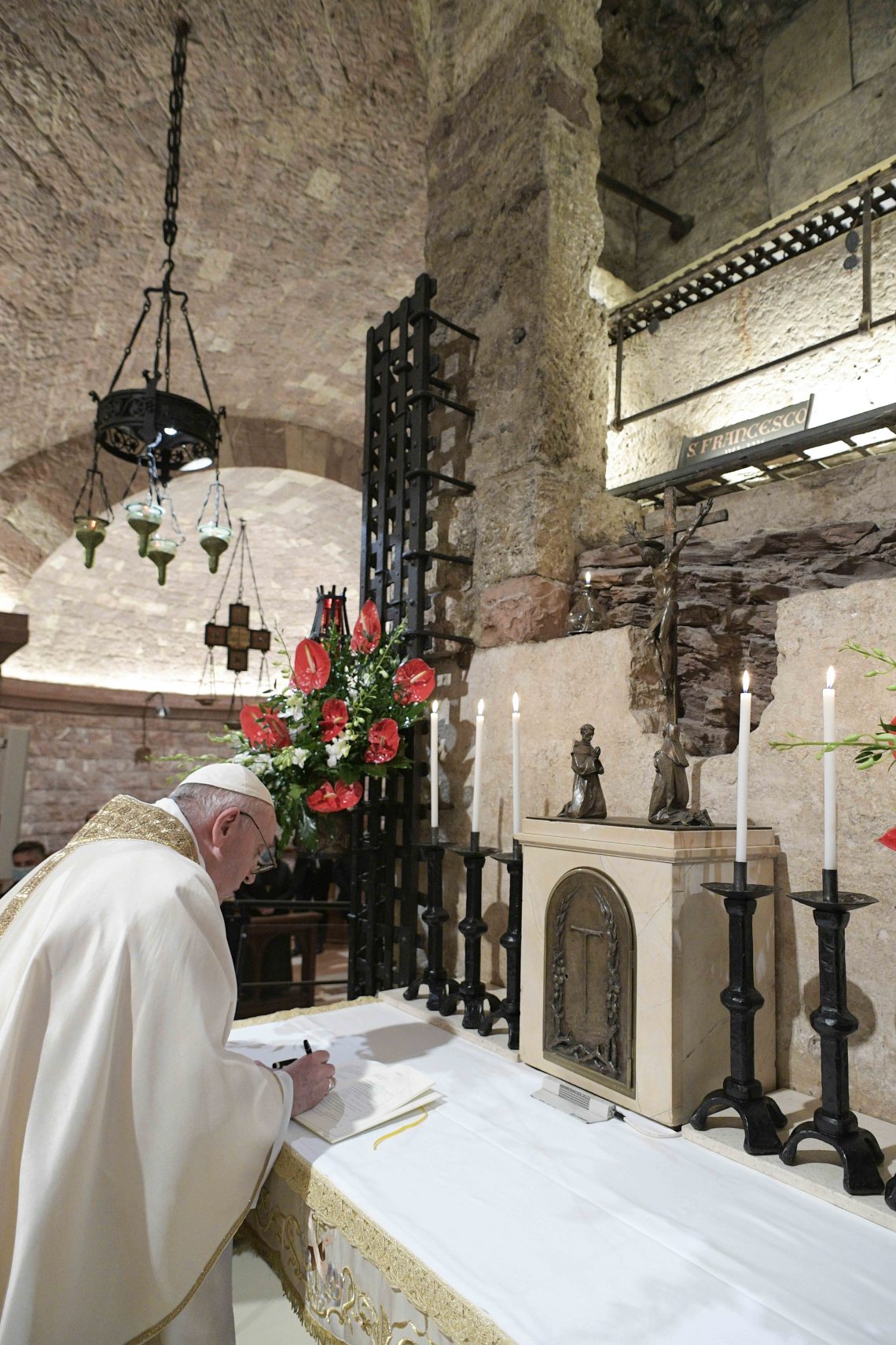 Pope Francis signs his new encyclical, “Fratelli Tutti, on Fraternity and Social Friendship” after celebrating Mass at the Basilica of St. Francis in Assisi, Italy, Oct. 3, 2020. Young people from around the world met...
