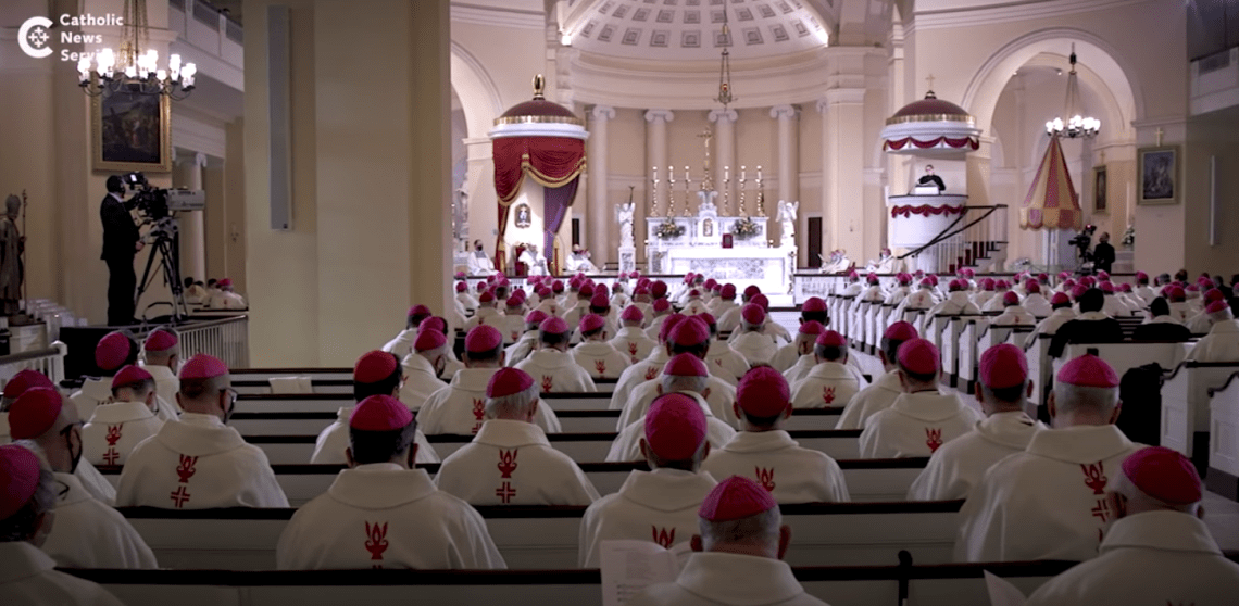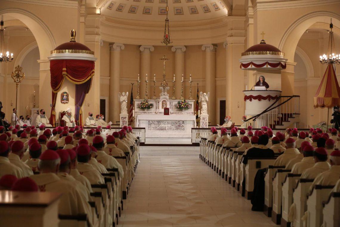 Bishops attend Mass Nov. 15, 2021, at the Basilica of the National Shrine of the Assumption of the Blessed Virgin Mary in Baltimore during the fall general assembly of the U.S. Conference of Catholic Bishops. Due to the COVID-19...