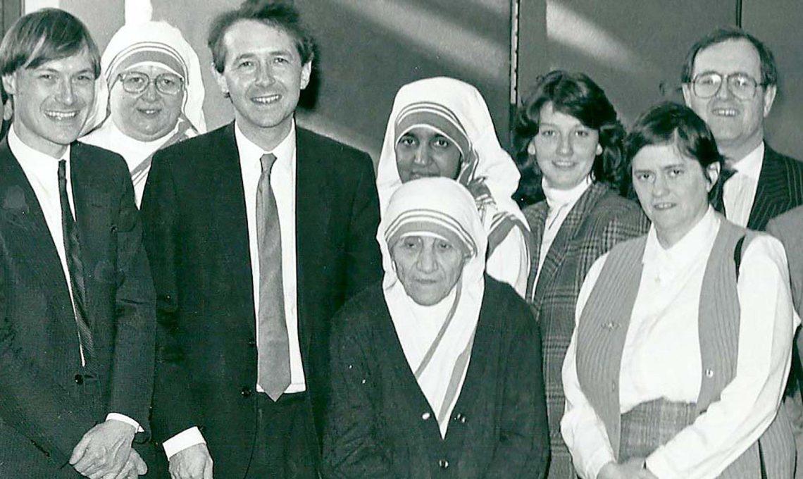 British lawmaker David Amess, farthest left, poses for a picture with a group that includes Mother Teresa in London’s Parliament in this 1988 photo. Amess was stabbed while meeting constituents in Leigh-on-Sea, England, Oct...