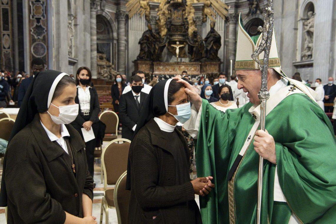 Pope Francis blesses Sister Gloria Cecilia Narváez Argot, a member of the Franciscan Sisters of Mary Immaculate, at the end of Mass Oct. 10, 2021, in St. Peter’s Basilica at the Vatican. The sister, a missionary from...