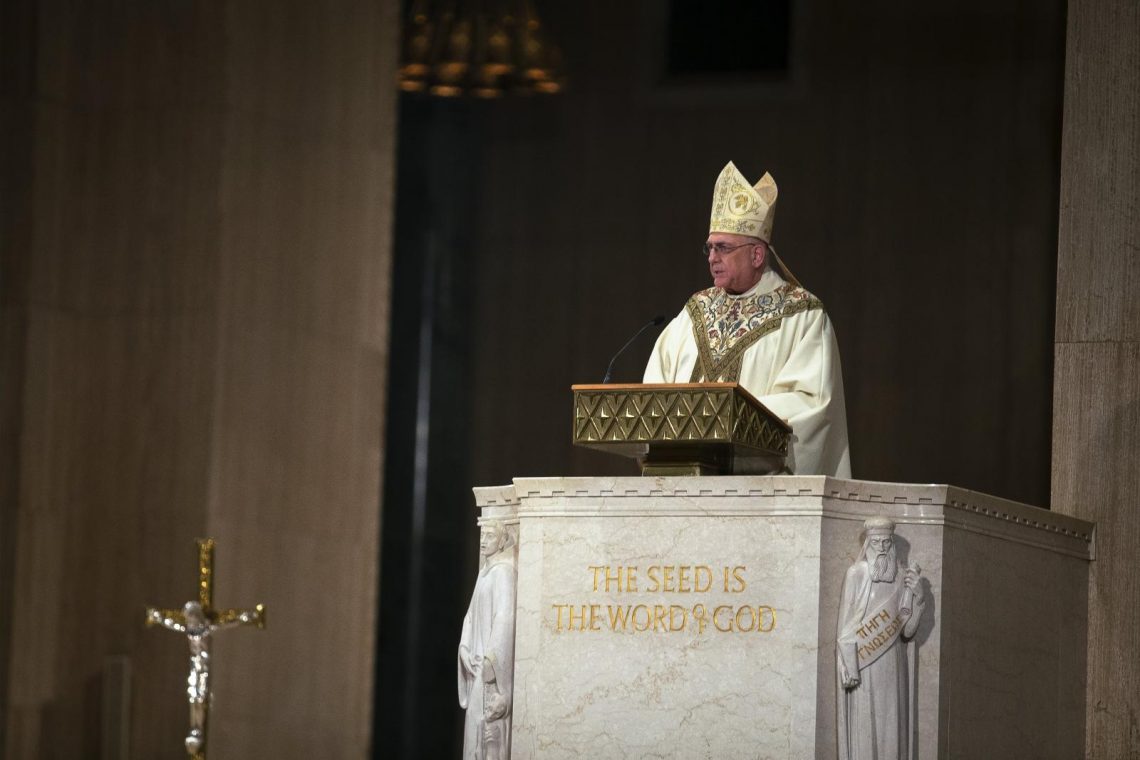 Archbishop Joseph F. Naumann, chairman of the U.S. bishops’ Committee on Pro-Life Activities, delivers the homily during the opening Mass of the National Prayer Vigil for Life at the Basilica of the National Shrine of the...