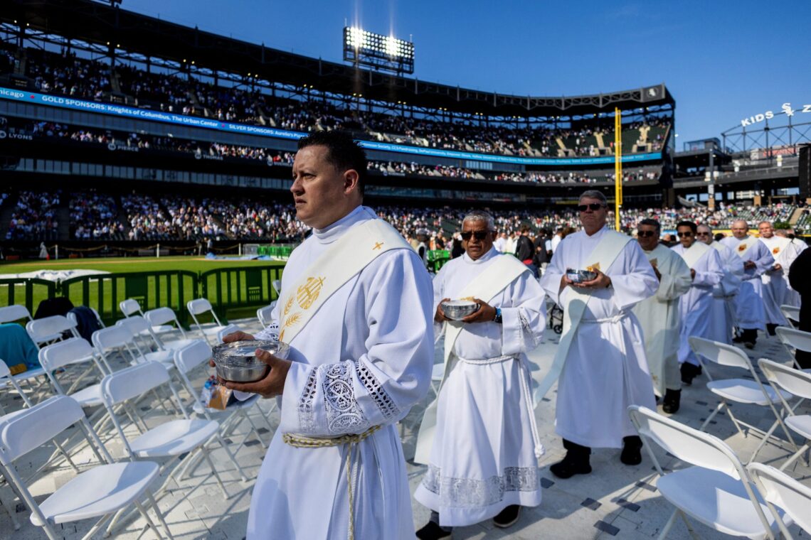 Under a bright sun, around an altar set up at centerfield, more than a dozen priests and bishops led by Chicago Cardinal Blase J. Cupich concelebrated a special Mass for the election of a first-ever Chicago-born pope. Trinity...