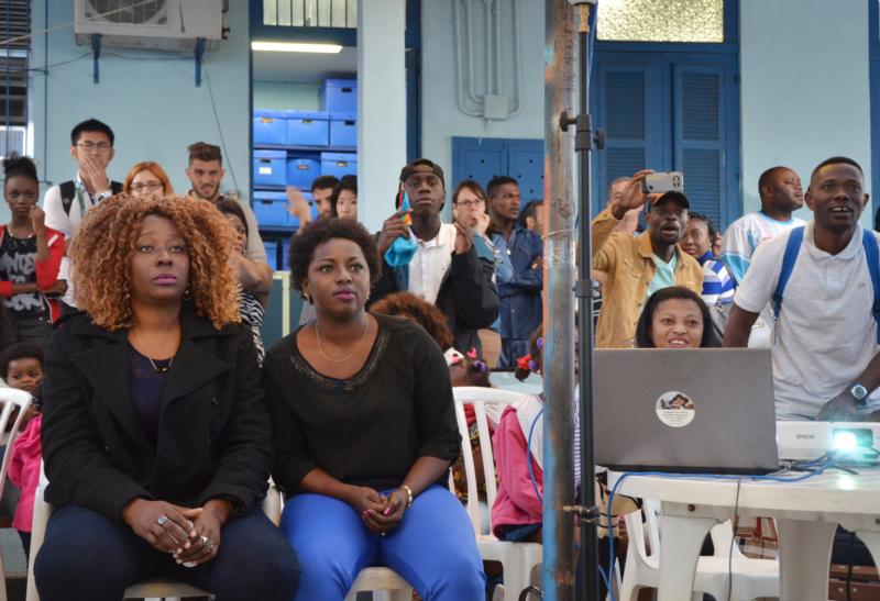 Glued to the improvised screen set up on the patio of the Caritas house, the refugees yelled and they cried. But most of all, they cheered. They cheered for their two Congolese colleagues, Popole Misenga, 24, and Yolande Mabika...