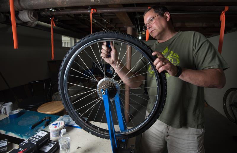 Tom Mayhew spins the rear tire of a bicycle secured firmly on a repair rack.