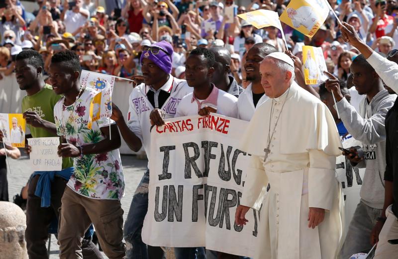 Flanked by a group of refugees, Pope Francis appealed to Christians to care for and welcome those whom society often excludes.