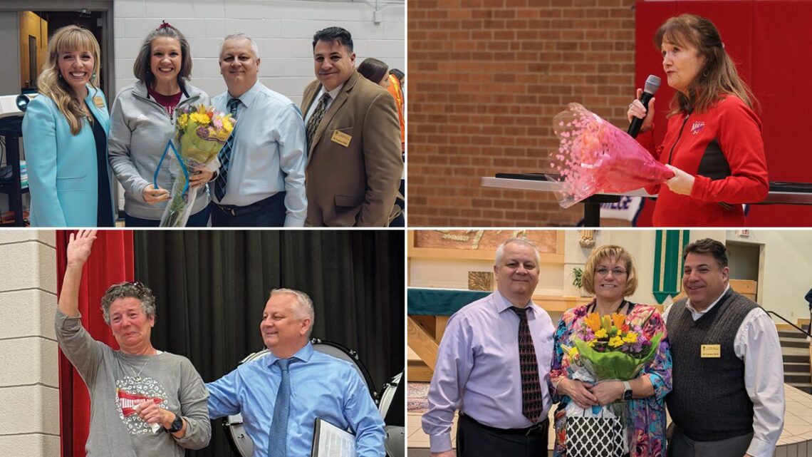 The archdiocese honored two Teachers of the Year and two Counselors of the Year during surprise assemblies at their schools. The honorees, from top left moving clockwise, are: Samantha Hendrix, Elaine Schmidtberger, Kathleen...