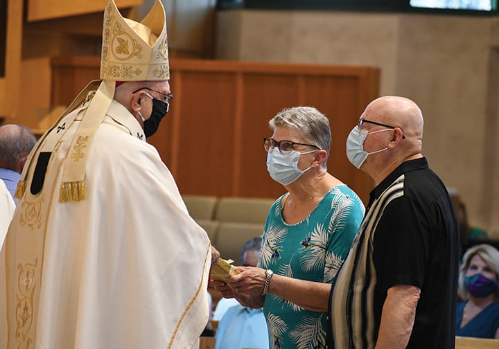 After his homily, Archbishop Naumann asked the couples to turn to each other as he led them in a renewal of their marriage vows. After Communion, each couple was invited to come forward to receive a gift: a marriage crucifix, featuring two intertwined rings. And before the dismissal, the archbishop prayed a blessing over all the couples.