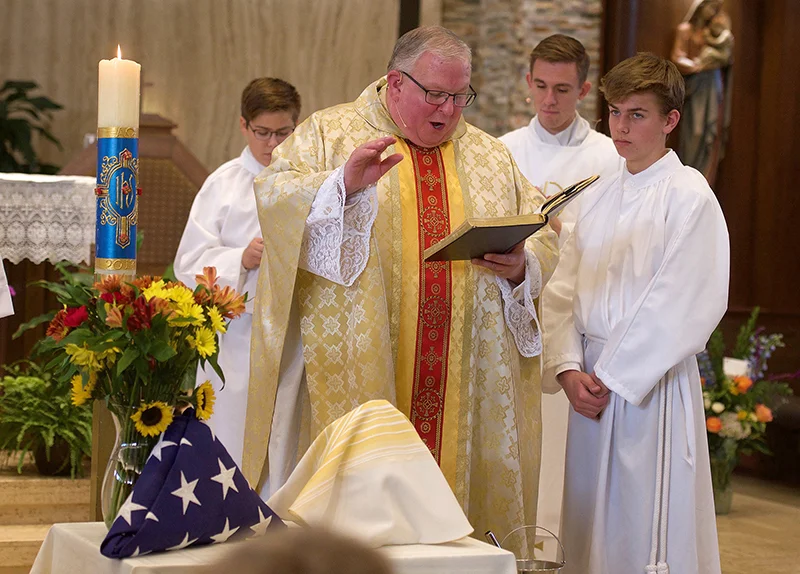 Father Rick Storey, pastor of Curé of Ars Parish, Leawood, celebrates the funeral Mass of David St. John, an 80-year-old Air Force veteran. No one was expected to attend the funeral but, after Father Storey asked parishioners to consider attending, more than 1,000 showed up. LEAVEN PHOTO BY JOE MCSORLEY
