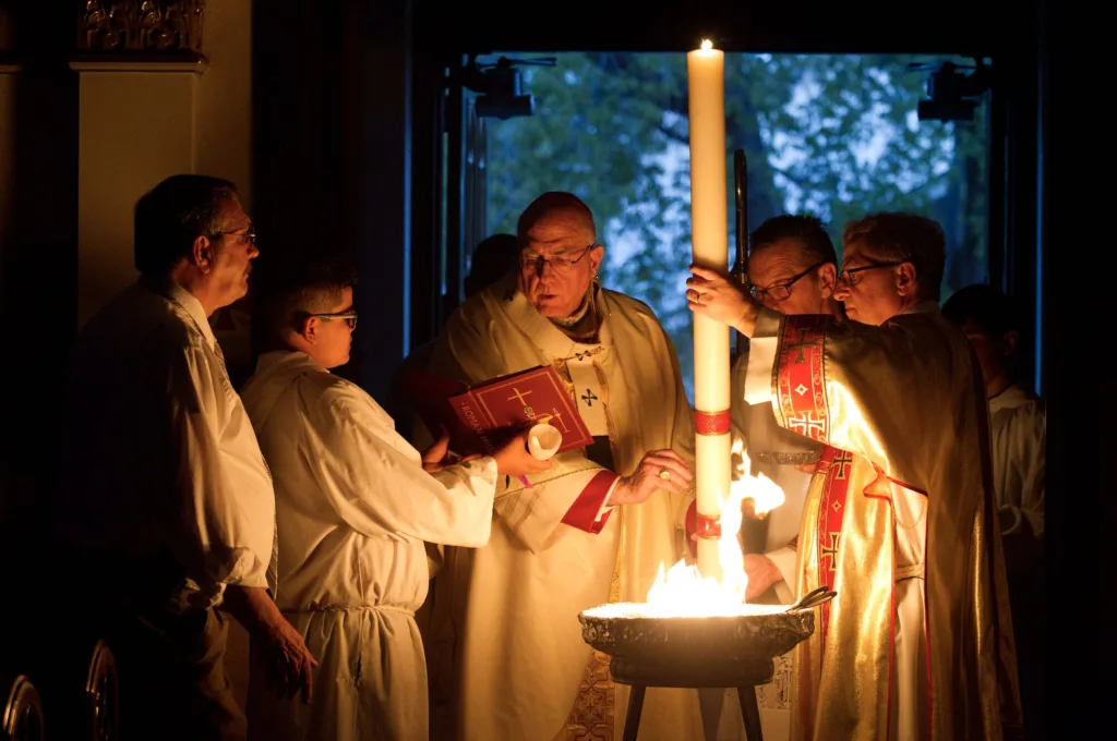 Archbishop Emeritus Joseph F. Naumann lights the paschal candle during an Easter Vigil Mass at the Cathedral of St. Peter the Apostle in Kansas City, Kansas. LEAVEN FILE PHOTO BY JAY SOLDNER