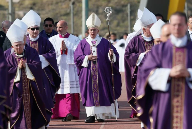 Pope Francis arrives in procession to celebrate Mass with priests and religious at a stadium in Morelia, Mexico, Feb. 16. (CNS photo/Paul Haring)