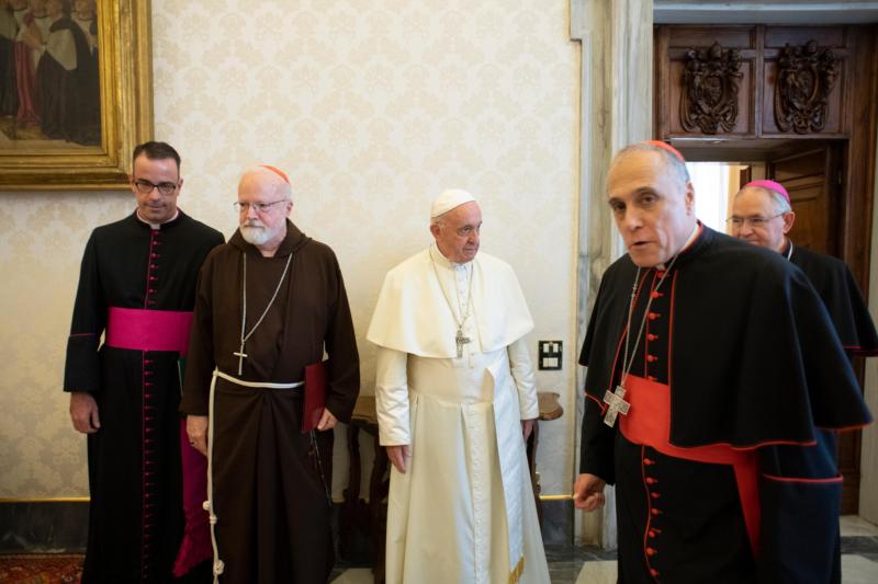 Pope Francis is pictured after posing for a photo with officials representing the U.S. Conference of Catholic Bishops at the Vatican Sept. 13. The meeting came as the U.S. church was responding to the sexual abuse crisis. From left are Msgr. J. Brian Bransfield, general secretary of the conference; Cardinal Sean P. O’Malley of Boston, president of the Pontifical Commission for the Protection of Minors; Cardinal Daniel N. DiNardo of Galveston-Houston, president of the conference; and Archbishop Jose H. Gomez of Los Angeles, vice president of the conference. (CNS photo/Vatican Media)