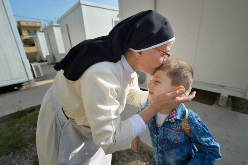 Dominican Sister Elene kisses 4-year old Luis Firas as he walks to a preschool in Ankawa, Iraq, April 7. The Dominican Sisters of St. Catherine of Siena were displaced by the Islamic State group in 2014 and have established schools and other ministries among the displaced. (CNS photo/Paul Jeffrey)