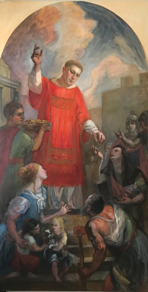St. Lawrence, a deacon in Rome in the third century, is known for his generosity and kindness toward the poor, sick and forgotten. This murals depicts him distributing alms to those in need. COURTESY PHOTO