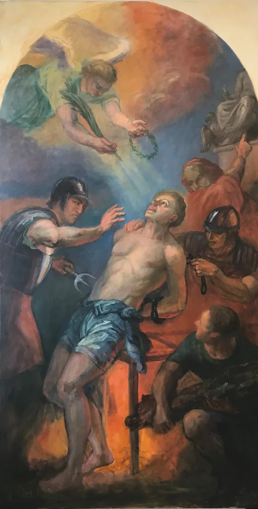 The second mural illustrates St. Lawrence’s true devotion to God through his martyrdom Aug. 10, 258. He faced a fiery death by roasting on a hot gridiron. COURTESY PHOTO