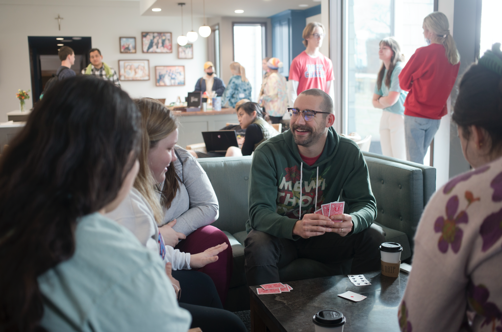 For example, we host Trivia Night and Open Mic Night events, which draw hundreds of students who might never otherwise set foot in a Catholic church. Taking advantage of the foot traffic from the dorms, we run a free pop-up coffee shop (Slow Drip) from our center, inviting students in for a free coffee and engaging them in conversation. Our monthly RISE Night serves as an entry point into conversations of faith. Over 125 students join us each month to engage in relevant questions of faith in the context of good community. In the course of the conversation, we weave in the Gospel message and invite them into an encounter with God in prayer through eucharistic adoration and praise and worship.