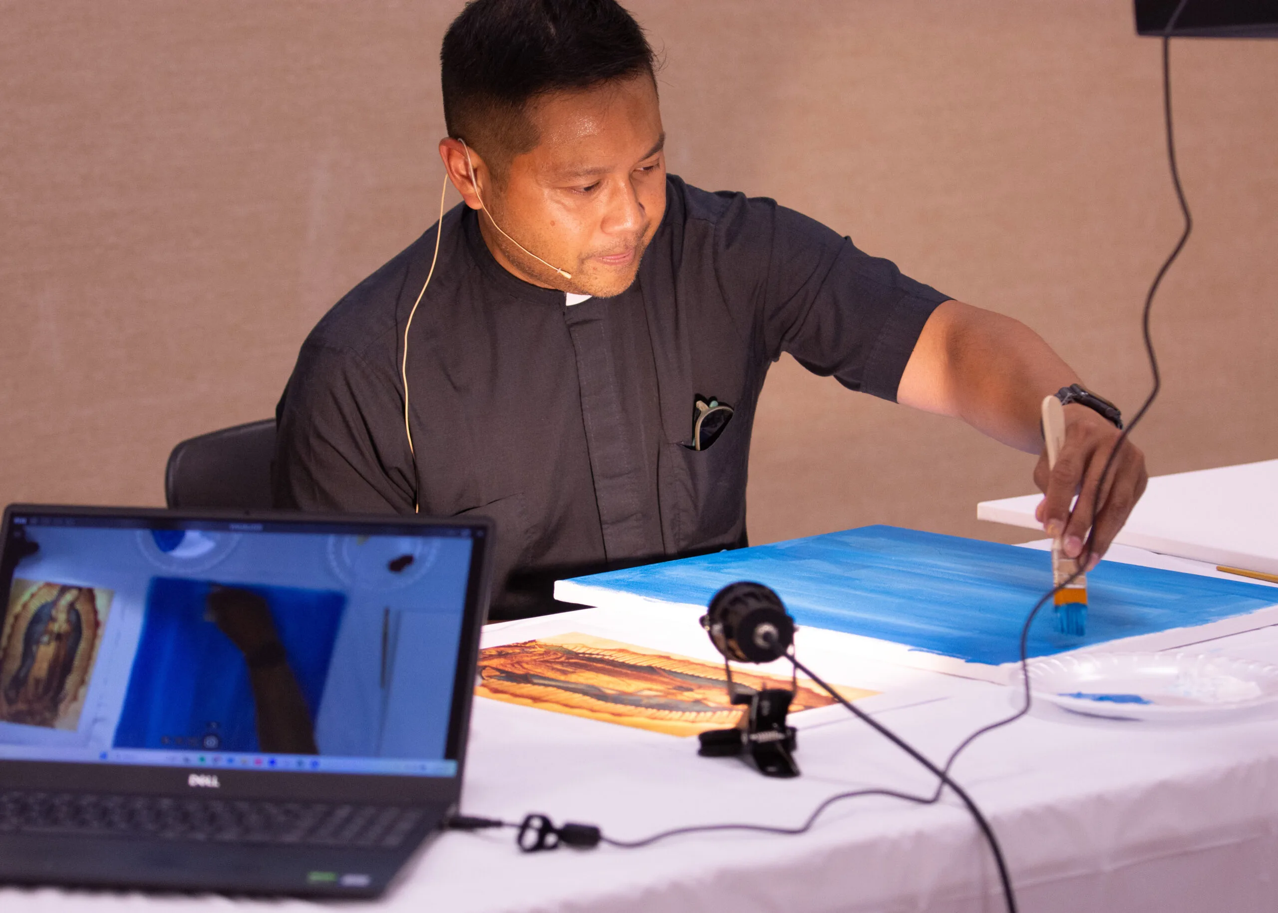 Father Alba gave some brief instructions and then demonstrated the process of creating each painting as his work was projected on a large screen above him.